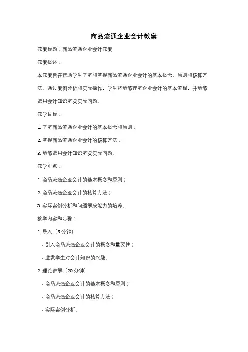 教学内容和步骤:1. 导入(5分钟)- 引入商品流通企业会计的概念和重要性;- 激发学生对会计知识的兴趣。