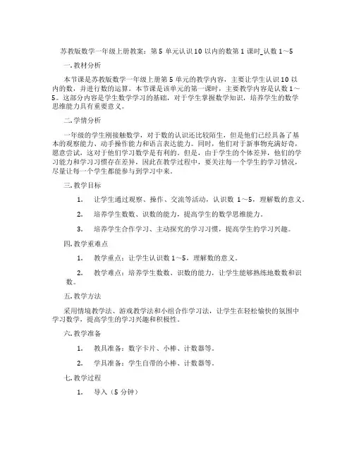 教学重点:掌握1、2、3、4、5的顺序和大小教学难点:认真书写教学过程:一.引入在一个晴朗的早晨,老师和同学们来到儿童乐园,这里有许多的玩具和小朋友,跟你的同桌说说,你看到了什么,分别有几个?二.新授1、出示例题图:说说图上画的是什么?用手指告诉老师物体的数量是几.2、用圆点表示1、2、3、4、5(学生边汇报教师边板书)(1)一个太阳、伸出1个小手指、画一个点子用1表示。