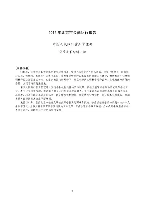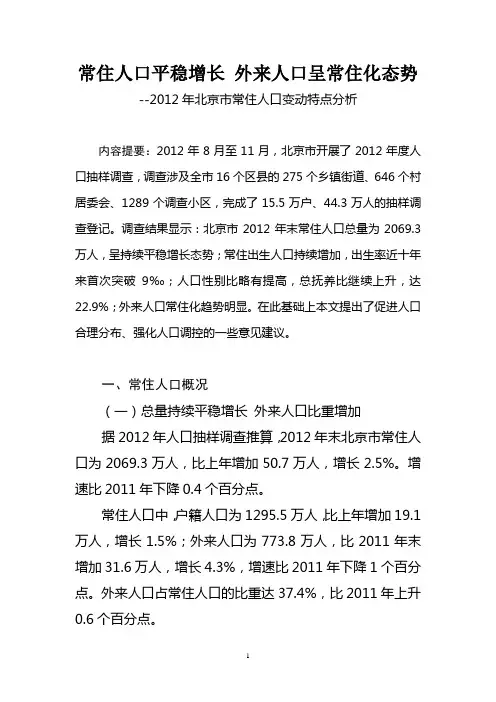 一、常住人口概况(一)总量持续平稳增长外来人口比重增加据2012年人口抽样调查推算,2012年末北京市常住人口为2069.3万人,比上年增加50.7万人,增长2.5%。