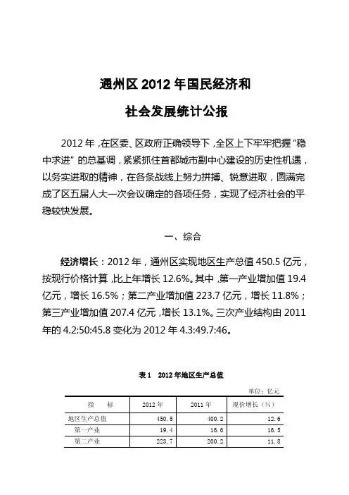 通州区2012年国民经济和社会发展统计公报2012年,在区委、区政府正确领导下,全区上下牢牢把握“稳中求进”的总基调,紧紧抓住首都城市副中心建设的历史性机遇,以务实进取的精神,在各条战线上努力拼搏、锐意进取,圆满完成了区五届人大一次会议确定的各项任务,实现了经济社会的平稳较快发展。
