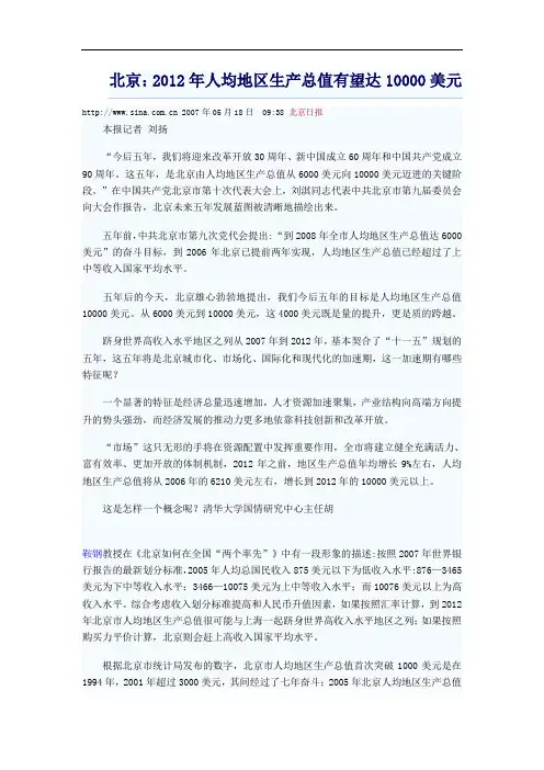 跻身世界高收入水平地区之列从2007年到2012年,基本契合了“十一五”规划的五年,这五年将是北京城市化、市场化、国际化和现代化的加速期,这一加速期有哪些特征呢?一个显著的特征是经济总量迅速增加,人才资源加速聚集,产业结构向高端方向提升的势头强劲,而经济发展的推动力更多地依靠科技创新和改革开放。