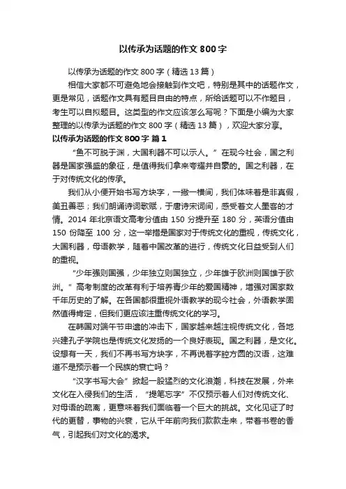 文档下载后可定制修改,请根据实际需要进行调整和使用,谢谢!并且,本店铺为大家提供各种类型的经典范文,如述职报告、调研报告、策划方案、活动方案、心得体会、应急预案、规章制度、教学资料、作文大全、其他范文等等,想了解不同范文格式和写法,敬请关注!Download tips: This document is carefully compiled by this editor. I hope that after you download it, it can help you solve practical problems. The document can be customized and modified after downloading, please adjust and use it according to actual needs, thank you!Moreover, our store provides various types of classic sample essays, such as job reports, research reports, planning plans, activity plans, personal experiences, emergency plans, rules and regulations, teaching materials, complete essays, and other sample essays. If you want to learn about different sample formats and writing methods, please pay attention!传承作文800字精选8篇通过反复修改作文,我们可以发现自己写作中的问题并加以改正,阅读可以培养我们的想象力和创造力,使作文更具独特性,以下是本店铺精心为您推荐的传承作文800字精选8篇,供大家参考。