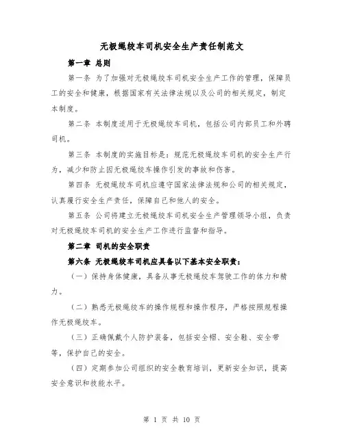 无极绳绞车司机安全生产责任制范文第一章总则第一条为了加强无极绳绞车司机安全生产工作,确保生产安全和职工身体健康,根据《中华人民共和国安全生产法》等相关法律、法规的规定,制定本责任制。