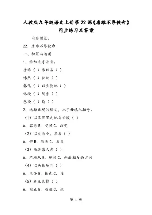 人教版九年级语文上册第22课《唐雎不辱使命》同步练习及答案内容预览:22.唐雎不辱使命一、积累与运用1.给加点字注音。