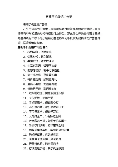 暑期手机促销广告语篇11、我的手机,沃的优惠2、信息时代,我引潮流3、要想省钱,就来联通店4、生活有联通,话费不心疼5、要想信号好,就来办联通包6、送一部手机,享多重实惠7、特价特到底,换购更有礼8、通话不要钱,充值更有送9、省钱是王道,联通帮你忙10、敢买就敢送,实惠话费送不停11、卡卡相传,优惠生活12、手机联通卡,便宜随心打13、不怕没话费,就怕你讲到口干14、不用寻常卡,便宜千万家15、元畅打全市,1毛畅打全国16、存话费送手机,联通手机数第一17、手机以旧换新,精彩惠动全城18、预存话费送手机,实惠多多包满意19、购机送话费,真的好实惠20、买联通卡送话费,多买多送21、天天新体验,惊喜等您捡22、存话费送手机,买手机送话费23、物美价廉,实惠多多24、话费套餐人人用,联通卡里天天送25、手机也能旧换新,服务群众惠民生26、品牌齐全任你选,保质保量价格低27、联通千万家,优惠你我他28、众里寻它千百度,实惠卡机在此处29、千里距离一线牵,你购电话我埋单30、买卡有优惠,购机送话费31、联通卡,你都不用,元芳觉得这有蹊跷32、没有最实惠只有更实惠,3G时代,联通你的生活33、让我们享受年轻,联通相恋更实惠34、更多优惠,更省话费,尽在联通卡35、情系联通,关爱家人36、联通真给力,省钱硬道理37、买手机,省钱才是王道38、惊喜无极限,省钱是关键;联通你我他,实惠送大家!39、买机送话费,充费送手机,旧机可换新,套卡更优惠40、选联通,超优惠,还有好礼送不停!41、以旧换新,存话费送手机,买手机送话费,套餐更实惠42、处处为你着想,处处让你实惠43、更多套餐选择,更多优惠活动,让您的更省钱更时尚44、元购机,以旧换新,存话费送手机,买手机送话费45、联通3G卡,便宜你我他,随身携带随便打暑期手机促销广告语篇21、手机华硕强,耐用待机长;现购送水杯,实惠共分享。