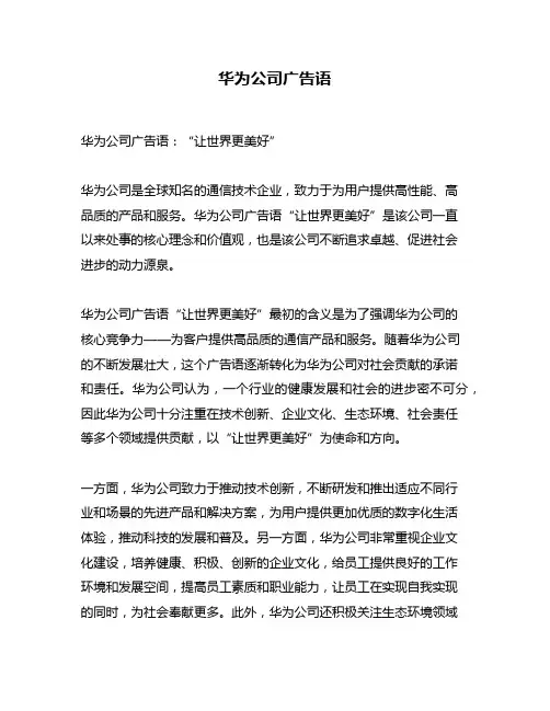 华为公司广告语华为公司广告语:“让世界更美好”华为公司是全球知名的通信技术企业,致力于为用户提供高性能、高品质的产品和服务。