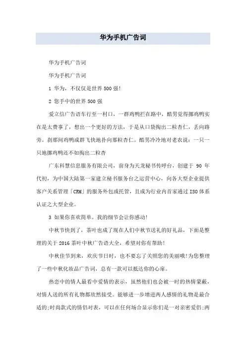 本篇文档将围绕华为手机广告词展开探讨,从不同角度分析华为手机广告词的特点及其所体现出的品牌形象。
