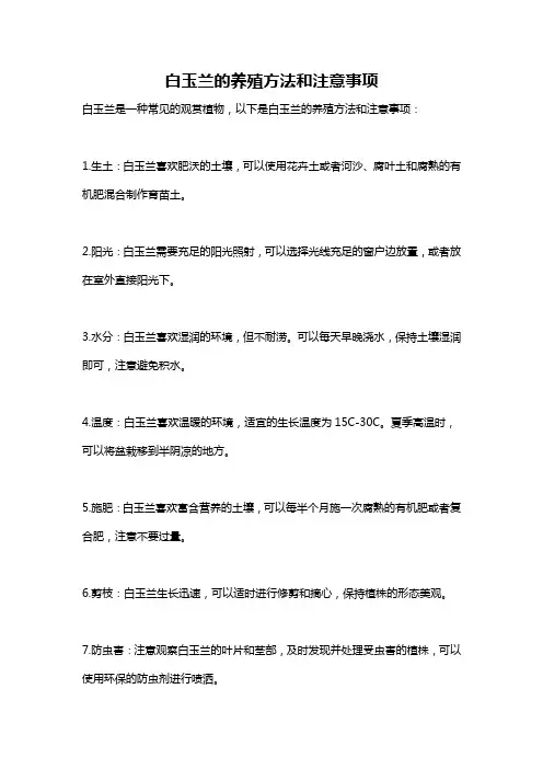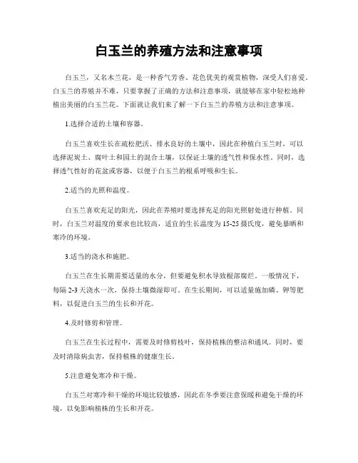 二、白玉兰的注意事项1.注意防治病虫害在白玉兰的生长过程中,需要注意防治病虫害。