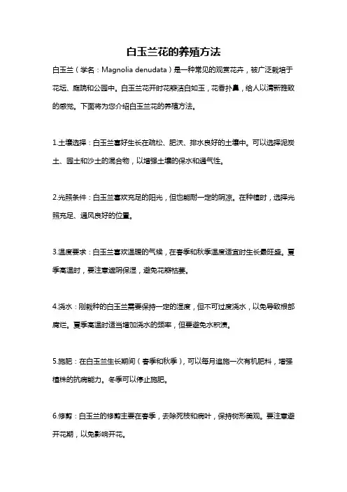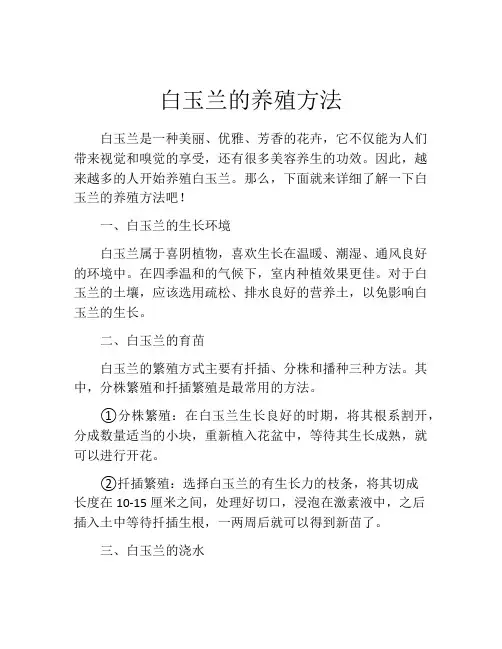一、白玉兰的养殖方法1.选择适当的土壤和环境白玉兰喜欢生长在肥沃、排水良好的土壤中,最好是土质疏松、富含有机质的土壤。