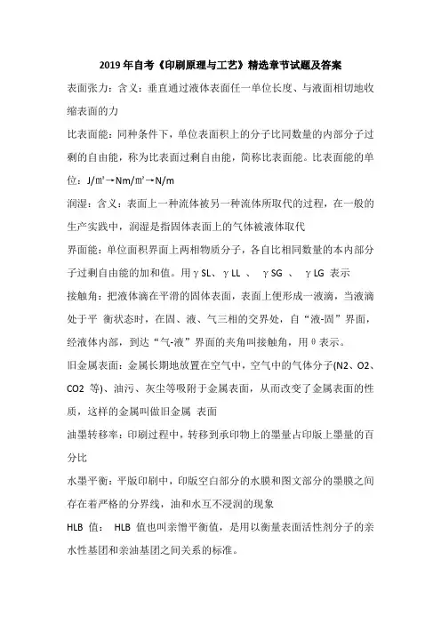 自学考试《印刷原理与工艺》练习试题一、名词解释表面张力:含义:垂直通过液体表面任一单位长度、与液面相切地收缩表面的力比表面能:同种条件下,单位表面积上的分子比同数量的内部分子过剩的自由能,称为比表面过剩自由能,简称比表面能。