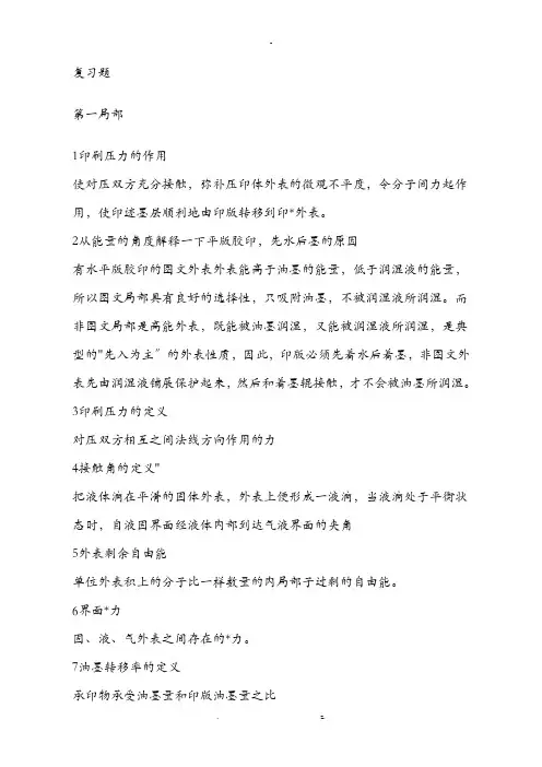 复习题第一局部1印刷压力的作用使对压双方充分接触,弥补压印体外表的微观不平度,令分子间力起作用,使印迹墨层顺利地由印版转移到印*外表。