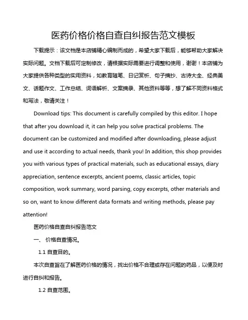 医疗机构药品价格自查报告通用一、引言为了规范医疗机构的药品价格管理,保障患者的合法权益,提高医疗服务质量,根据相关法律法规和政策要求,本医疗机构对药品价格进行了全面自查。