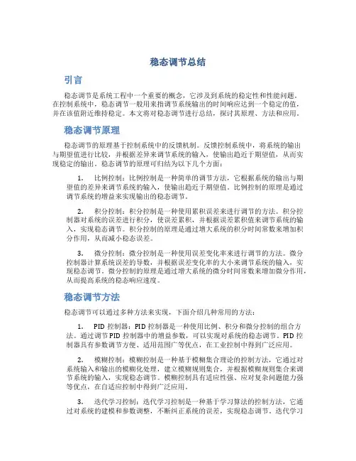 稳态调节方法稳态调节可以通过多种方法来实现,下面介绍几种常用的方法:1.PID控制器:PID控制器是一种使用比例、积分和微分控制的组合方法。