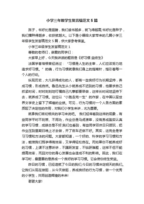 小学三年级学生发言稿范文1尊敬的老师们,亲爱的同学们:大家早上好,今天我讲话的题目是《好习惯益终生》法国学者培根曾经说过:“习惯是人生的主宰,人们应该努力地追求好习惯。