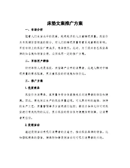 床垫文案推广方案一、市场分析随着人们生活水平的提高,越来越多的人注重睡眠质量。