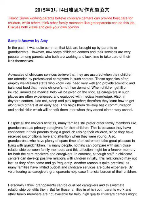 2015年3⽉14⽇雅思写作真题范⽂Task2: Some working parents believe childcare centers can provide best care for children, while others think other family members like grandparents can do this job. Discuss both views and give your own opinion.Sample Answer by AmyIn the past, it was quite common that kids are brought up by parents or grandparents. However, nowadays childcare centers and their services are very popular among parents who both are working and lack time to take care of their kids themselves.Advocates of childcare services believe that they are assured when their children are attended by professional caregivers in such centers. These agencies often employ well-trained staffs who know kids' need very well and provide scientific and balanced food that meets children's nutrition demand. When children get ill or injured, immediate medical help will be given on the spot, as caregivers in such places are often experienced and equipped with medical knowledge. Also, in daycare centers, kids eat, sleep and play together; therefore they learn how to get along with others at an early age. This helps them develop basic communication and social skills which will benefit them later when they attend elementary school. Despite all the obvious benefits, many families still prefer other family members like grandparents as primary caregivers for their children. This is because they have confidence in their parents doing a good job raising their children, since they have received unconditional love and attention when they were young. Also, grandparents who have plenty of spare time after retirement take great pleasure in living with grandchildren. To many people, nothing can compare with such close relationship between family members and this affection might be a forever memory for both the care receivers and caregivers. In contrast, although staff in childcare centers can develop positive relations with children initially, this relationship may not last as they often come and go frequently. Another reason is quite practical, as many families have limited budget and childcare services are quite expensive. By volunteering as caregivers grandparents help ease financial burden of their children. Personally I think grandparents can be qualified caregivers and this intimate relationship benefits them. But for those families in which both parents work and other family members are not available for help, high quality childcare centers mightmeet their needs. (By Amy From CA, US)----------------------新的⼀年,2015年的烤鸭们你们准备好了⽊有!前路虽未⼘,有Amy和你随⾏,所以请不要觉得孤单⽆助!接着⼴⽽告之:Amy倾⼒按话题分类整理好的雅思真题原创范⽂集现已发布!是真题范⽂集哦!不是⼤家常见的市⾯上所谓的8分范⽂,9分范⽂!真题有多么强的可借鉴性,⾼质量的真题范⽂⼜是多么稀缺,认真复习雅思考试或者已经和雅思考试打过交道的朋友们懂的!如果你或者⾝边的烤鸭对Amy这套范⽂集感兴趣,记得私信Amy的q: 2561503206 。