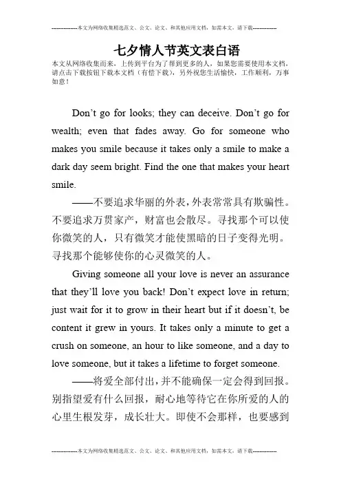 七夕情人节英文表白语本文从网络收集而来,上传到平台为了帮到更多的人,如果您需要使用本文档,请点击下载按钮下载本文档(有偿下载),另外祝您生活愉快,工作顺利,万事如意!Don’t go for looks; they can deceive. Don’t go for wealth; even that fades away. Go for someone who makes you smile because it takes only a smile to make a dark day seem bright. Find the one that makes your heart smile.——不要追求华丽的外表,外表常常具有欺骗性。