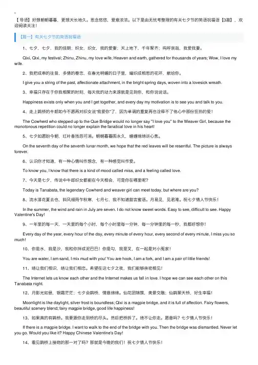 以下是由⽆忧考整理的有关七⼣节的英语祝福语【3篇】,欢迎阅读关注!【篇⼀】有关七⼣节的英语祝福语 1、七⼣,七⼣,我的佳期;织⼥,织⼥,我的爱妻;天上地下,千年聚齐;呜呼哀哉,我爱我妻。