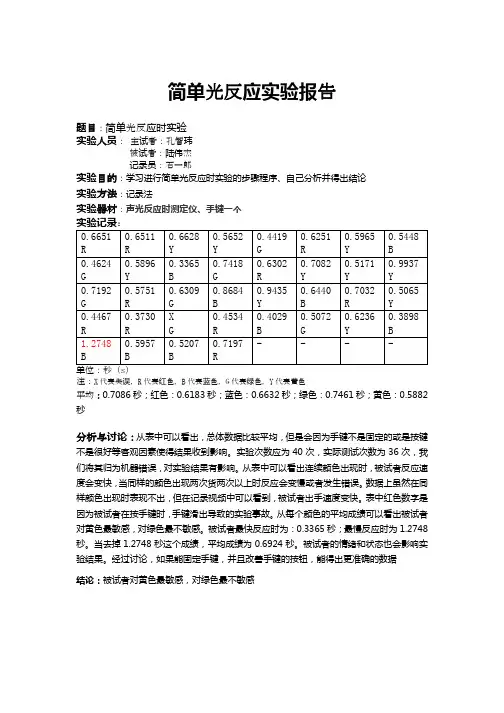 实验报告信息栏学院:初等教育学院专业:应用心理学姓名:张东星同组成员:张冰、杨亚楠学号:2014160331016 实验日期:2016.3.24光选择反应时实验报告结果1.实验结果的原始记录数据,经整理后参见附表1,光选择反应时测定实验原始记录数据和光简单反应时测定实验原始记录数据。