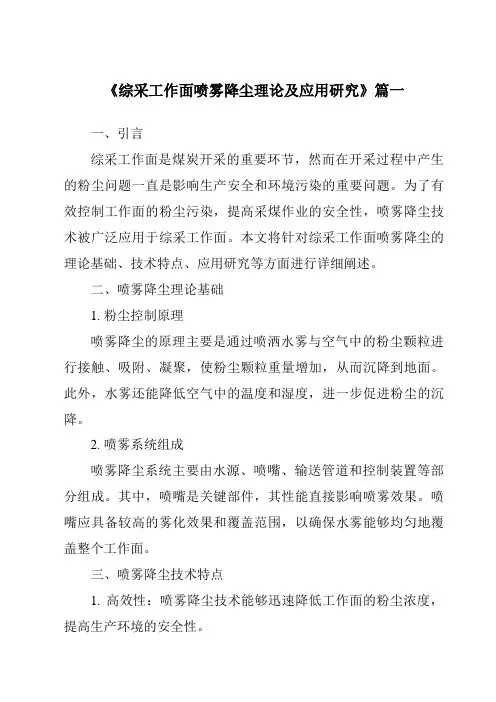 《综采工作面喷雾降尘理论及应用研究》篇一一、引言综采工作面是煤炭开采的重要环节,然而在开采过程中产生的粉尘问题一直是影响生产安全和环境污染的重要问题。