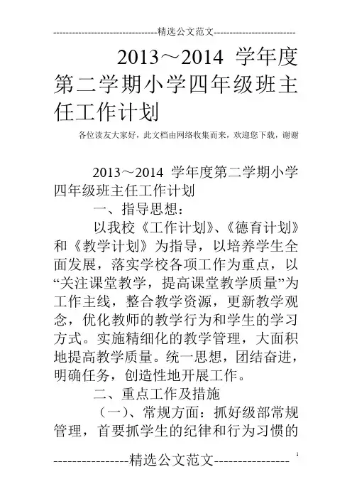 2013--2014学年度第二学期四年级一班班主任工作计划2013--2014学年度第二学期我班继续在第一学期的基础上重点抓好班风学风的建设,落实以德为先,以育人为主的工作纲要,努力培养学生德智体美劳全面发展。