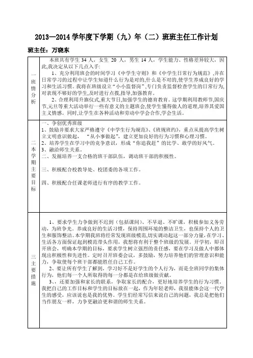 2013-2014下期班主任工作计划一转眼时间很快,今年到了初中的最后一年.我也继续担任本班的班主任工作.初三是初中三年的关键时刻,对学生来说,取得好成绩就是最重要的事情.现在班级班风比较稳定,学习成绩在全级也是不错,所以这个学期我们班就要在班风稳定的基础上继续抓好学风建设,争取取得更好的成绩.为了达到这个目标,我制定了以下计划.一.继续抓好班风建设,带动良好的学风.1.重视卫生,宣传评比.评比是班风的重要体现,去年我们班的评比成绩比较好,所以今年要继续把这项工作做好,从而保持班风的稳定.2.继续规范好仪容仪表.学生的仪容仪表也是良好学习风气的一种体现.虽然今年是初中的最后一年,学习比较忙,但也不能放松这项工作,从衣着到头发打扮都要符合学校的要求.3.狠抓课堂纪律.课堂纪律不好会直接导致学习成绩的下降,所以我一直以来都非常强调要保持好课堂纪律.这个学期我就准备继续加大监管力度,不但要班干部认真做好记录,还要求各科任老师配合,我平时也多到班上看一看,了解好班里的纪律情况.二. 加强中下生的辅导转化工作. 注重对学生的学法指导.这是提高全班成绩的关键所在,所以这个学期一定要抓好对中下生的辅导和转化工作,制定好计划,在班中全面铺开,平时尽量多下班,了解中下生的学习困难,尽可地提高中下生的学习成绩,从而进一步提高全班总体成绩. 我还计划加强与各任课教师的联系,以对学习困难者联手帮助。
