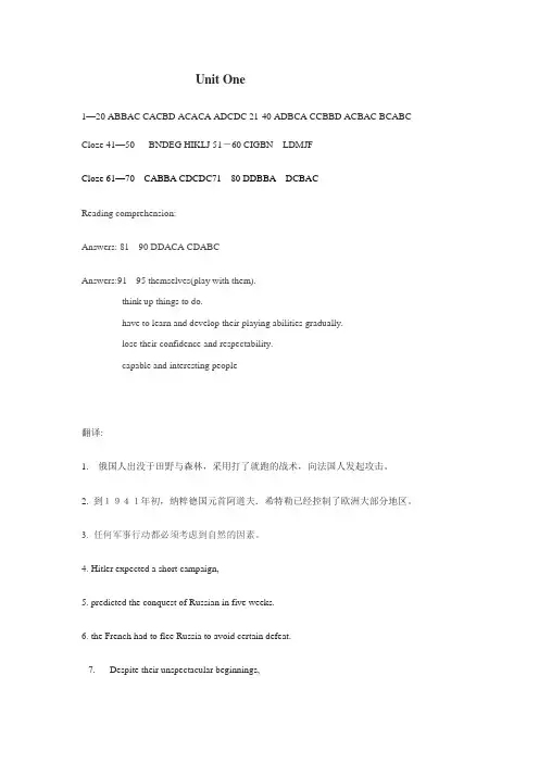 Unit One1—20 ABBAC CACBD ACACA ADCDC 21-40 ADBCA CCBBD ACBAC BCABC Cloze 41—50 BNDEG HIKLJ 51-60 CIGBN LDMJFCloze 61—70 CABBA CDCDC71---80 DDBBA DCBACReading comprehension:Answers: 81---90 DDACA CDABCAnswers:91---95 themselves(play with them).think up things to do.have to learn and develop their playing abilities gradually.lose their confidence and respectability.capable and interesting people翻译:1.俄国人出没于田野与森林,采用打了就跑的战术,向法国人发起攻击。