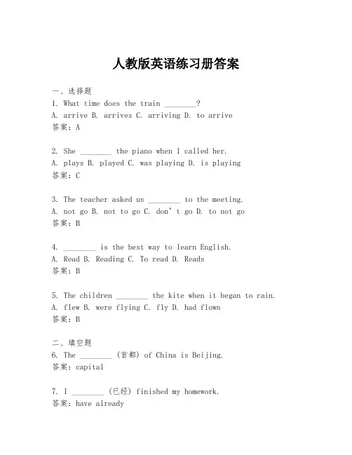 人教版英语练习册答案一、选择题1. What time does the train ________?A. arriveB. arrivesC. arrivingD. to arrive答案:A2. She ________ the piano when I called her.A. playsB. playedC. was playingD. is playing答案:C3. The teacher asked us ________ to the meeting.A. not goB. not to goC. don’t goD. to not go答案:B4. ________ is the best way to learn English.A. ReadB. ReadingC. To readD. Reads答案:B5. The children ________ the kite when it began to rain.A. flewB. were flyingC. flyD. had flown答案:B二、填空题6. The ________ (首都) of China is Beijing.答案:capital7. I ________ (已经) finished my homework.答案:have already8. She ________ (决定) to go to university.答案:decided9. The ________ (历史) of this city is very rich.答案:history10. He ________ (忘记) his keys at home.答案:forgot三、完型填空Once upon a time, there was a boy named Tom. He was very curious and loved to explore new things. One day, he found a map in his grandfather's old box. The map showed a hidden treasure. Tom decided to go on an adventure to find the treasure.The map was old and ________ (11), but Tom could still read the directions. He packed his backpack with some food, a flashlight, and a compass. He started his journey early in the morning and followed the map to a forest. In the forest, he met a wise old owl who ________ (12) him some advice. The owl said, "Be careful and trust your instincts."Tom continued his journey and finally reached a cave. He entered the cave with his flashlight and found the treasure chest. Inside the chest, there was a note that said, "The real treasure is the journey itself and the friends you make along the way."11. A. dirty B. clear C. torn D. new答案:C12. A. gave B. took C. borrowed D. returned答案:A四、阅读理解Passage 1Tom's family went on a trip to the countryside. They enjoyed the fresh air and beautiful scenery. They visited a farm and saw cows, sheep, and chickens. Tom's father taught him how to milk a cow. Tom was very excited and said it was a new experience for him. In the evening, they had a barbecue and enjoyed the delicious food.Questions:13. Where did Tom's family go?A. The cityB. The countrysideC. The beachD. The mountains 答案:B14. What animals did they see on the farm?A. Cows, sheep, and chickensB. Dogs, cats, and horsesC. Birds, fish, and insectsD. Lions, tigers, and bears答案:A15. What did Tom learn to do?A. Ride a horseB. Milk a cowC. Shear a sheepD. Feed chickens答案:BPassage 2Lily is a student who loves to read. She has a big collectionof books in her room. She reads different genres, such as fiction, non-fiction, and poetry. Lily also enjoys writing stories and poems. She hopes to become a writer one day.16. What does Lily enjoy doing?A. Reading booksB. Watching moviesC. Playing sportsD. Listening to music答案:A17. What types of books does Lily have in her collection?A. Only fictionB. Only non-fictionC. Fiction, non-fiction, and poetryD. Only poetry答案:C18. What is Lily's dream?A. To become a teacherB. To become a doctorC. To become a writerD. To become an artist答案:C结束语:通过以上练习,我们复习了英语语法、词汇和阅读理解等基础知识,希望同学们能够认真练习,不断提高自己的英语水平。