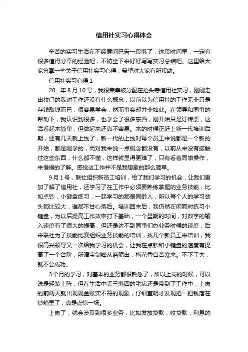 信用社实习心得120__年8月10号,我很荣幸被分配在抬头寺信用社实习,刚刚走出校门的我对工作还没有什么概念,以前以为信用社的工作无非只是存钱取钱而已,很容易学会,然而事实却并非如此。
