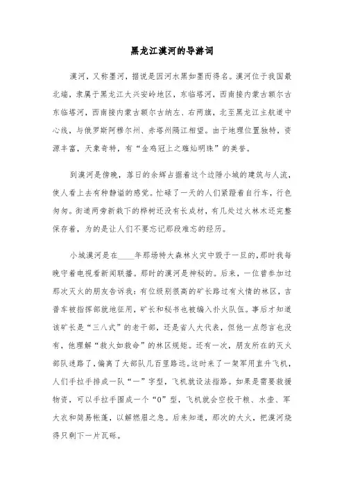黑龙江黑河导游词(3篇)黑龙江黑河导游词(精选3篇)黑龙江黑河导游词篇1黑河市地处大兴安岭东端,小兴安岭北部。