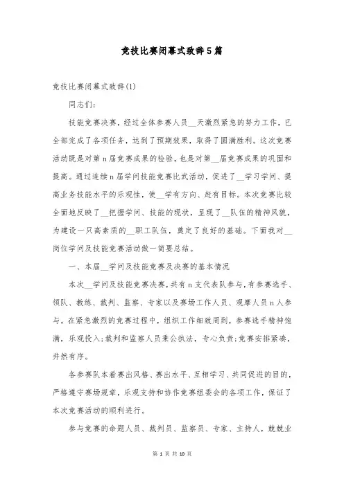 比赛闭幕式结束致辞范本5篇比赛闭幕式结束致辞范本篇1尊敬的各位领导、敬爱的老师、友爱的同学们,大家下午好。