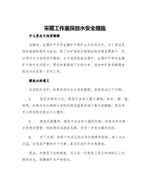 采掘工作面探放水的防范措施1.安全勘探在采矿之前,必须进行充分的水文地质勘探工作。
