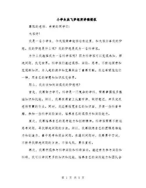 让我们一起努力学习,不断进取,为实现自己的梦想而努力奋斗吧!谢谢大家!小学生放飞梦想演讲稿模板(二)尊敬的老师、亲爱的同学们:大家好!我是XX小学五年级的同学,今天我很荣幸站在这里,与大家分享我的梦想。