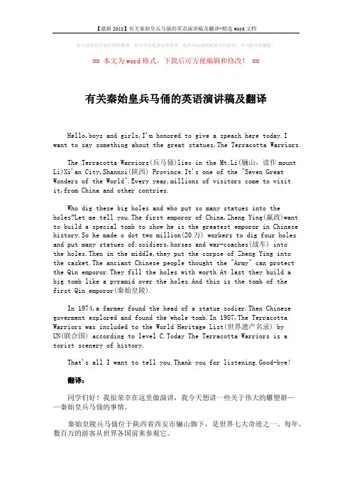 【最新2018】有关秦始皇兵马俑的英语演讲稿及翻译-精选word文档本文部分内容来自网络整理,本司不为其真实性负责,如有异议或侵权请及时联系,本司将立即删除!== 本文为word格式,下载后可方便编辑和修改! ==有关秦始皇兵马俑的英语演讲稿及翻译Hello,boys and girls,I'm honored to give a speach here today.I want to say something about the great statues,The Terracotta Warriors.The Terracotta Warriors(兵马俑)lies in the Mt.Li(骊山,读作mount Li)Xi'an City,Shannxi(陕西) Province.It's one of the "Seven Great Wonders of the World".Every year,millions of visitors come to visit it,from China and other contries.Who dig these big holes and who put so many statues into the holes?Let me tell you.The first emporor of China,Zheng Ying(嬴政)want to build a special tomb to show he is the greatest emporor in Chinese history.So he made o dot two million(20万) workers to dig four holes and put many statues of soidiers,horses and war-coaches(战车) intothe holes.Then in the middle,they put the corpse of Zheng Ying into the casket.The anciant Chinese people thought the "Army" can protect the Qin emporor.They fill the holes with worth.At last they build abig tomb like a pyramid over the holes.And this is the tomb of thefirst Qin emporor(秦始皇陵).In 1974,a farmer found the head of a statue sodier.Then Chinese goverment explored and found the whole tomb.In 1987,The Terracotta Warriors was included to the World Heritage List(世界遗产名录) byUN(联合国) according to level C.Today The Terracotta Warriors is a torist scenery of history.That's all I want to tell you.Thank you for listening.Good-bye!翻译:同学们好!我很荣幸在这里做演讲,我今天想讲一些关于伟大的雕塑群——秦始皇兵马俑的事情。