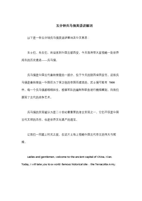 五分钟兵马俑英语讲解词以下是一份五分钟兵马俑英语讲解词及中文意思:女士们、先生们,欢迎来到中国古都西安,今天我将带大家领略一处世界闻名的历史遗迹——兵马俑。