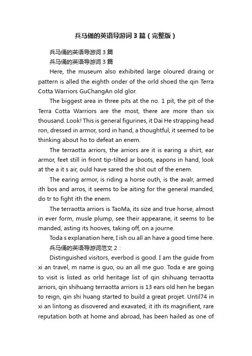 兵马俑的英语导游词3篇(完整版)兵马俑的英语导游词3篇兵马俑的英语导游词3篇Here, the museum also exhibited large oloured draing or pattern is alled the eighth onder of the orld shoed the qin Terra Cotta Warriors GuChangAn old glor.The biggest area in three pits at the no. 1 pit, the pit of the Terra Cotta Warriors are the most, there are more than six thousand. Look! This is general figurines, it Dai He strapping head ron, dressed in armor, sord in hand, a thoughtful, it seemed to be thinking about ho to defeat an enem.The terraotta arriors, the arriors are it is earing a shirt, ear armor, feet still in front tip-tilted ar boots, eapons in hand, look at the a it s air, ould have sared the shit out of the enem.The earing armor, is riding a horse outh, is the avalr, armed ith bos and arros, it seems to be aiting for the general manded, do tr to fight ith the enem.The terraotta arriors is TaoMa, its size and true horse, almost in ever form, musle plump, see their appearane, it seems to be manded, asting its hooves, taking off, on a journe.Toda s explanation here, I ish ou all an have a good time here.兵马俑的英语导游词范文2:Distinguished visitors, everbod is good. I am the guide from xi an travel, m name is guo, ou an all me guo. Toda e are going to visit is listed as orld heritage list of qin shihuang terraotta arriors, qin shihuang terraotta arriors is 13 ears old hen he began to reign, qin shi huang started to build a great projet. Until74 in xi an lintong as disovered and exavated, it ith its magnifient, rare reputation both at home and abroad, has been hailed as one ofthe eight ondersof the orld .First of all, e ame to a pit, the pit is the largest of three pits a pit, the pit depth of 5 meters, overs an area of about 14260 square meters, ho, enough! Not onl big and arrior figures is the no. 1 pit, pit is about more than 600 TaoRen, TaoMa, their orderl arranged in annular square, the eastern end of the pit, the arriors have three olumns rank them ith bos, rossbos, hand eapons, suh as long shots like, like for striker troops. Folloed b more than 600 armor of the main bod of troops, and amraphel, holding spear gun isometri eapon,ith 35 b a team of four horses hariots have eleven holes arranged in 38 olumns and 30 eight-a olumns. The arriors in pit no. 1 unearthed in total more than 500 piees, horse 24 driving six hariots.The arrior figures in the no. 1 pit of different, image lifelike, lifelike. You see: some arrior figures in ith a smile, seem to e up ith a magi eapon to defeat the enem; Some just looked at the sk, seem to be missing loved ones far XX; Some serious fae, as if determined defend; And lenhed his fist, glared at the front, as if to marh at an time. These amazing arrior figures and hariot, trul reflet the generation of emperor qin unified the six ountries of ambition.No please enjo freedom, please onsiousl abide b the relevant regulations of the museum, don t litter, don t spit, graffito of the sribble not to. Ok, please enjo the ondensed the anient orking people s isdom and seat in our ountr a great mirale, to feel the histor of the gut-renhing, thundering!Toda s trip to the Terra Cotta Warriors ame to an end, I hope ou e bak to visit the anient it of xi an. Thank ou, goodbe!兵马俑的英语导游词范文3:Everbod is good! I am dream travel a good tour guide. T oda, it s a pleasure to go side b side has been listed in the orld heritage list of qin shihuang s mausoleum and the Terra Cotta Warriors pit. So let s start no!Qin Terra Cotta Warriors pit is qin shihuang PeiZangKengb 1, 2, 3 of the pit. Toda has been built museum. The Terra Cotta Warriors are arranged in arra, a splendor. The Terra Cotta Warriors general points figurines avalr TaoMa thearriors figures, et. The museum also exhibited large paint here. Knon as the eighth onder of the orld shoed the qin Terra Cotta Warriors GuChangAn old glor.No e have reahed a destination - a pit. The biggest areain three pits at the no. 1 pit, hat is 230 meters long, north and south 62 meters ide, ith a total area of 14260 square meters! The pit of the Terra Cotta Warriors is also the most, there are more than 6000!So no I ill lead ou to see the tpes of terraotta arriors together! During the visit, please do not litter, spit, damage publi ultural relis and so onLook! This is the general figures. It burl, head Dai He ron, the bod overed ith armor, still hold a sord in his hand, see like it thoughtfull, as if in thinking about ho to beatoff the huns arm!The terraotta arriors alled. It ears a shirt to ear armor, feet still in front tip-tilted ar boots, eapons in hand, look at the a he had, that the enem sared the shit out of!Look at the outh of the earing armor is riding a horse,is the avalr, he armed ith bos and arros as if aiting for the general manded, go ith the arm of huns as deadl endeavoring!The Terra Cotta Warriors is TaoMa, it to the size of the real horse, in all forms, musle fullness. Look at the experiene so that it looks like, as manded, asting its hooves, taking off, on a journe!兵马俑的英语导游词附送:兵马俑短导游词200字5篇兵马俑短导游词200字5篇兵马俑短导游词200字范文1:现在,我们面对的是秦俑馆一号坑,坑里就是号称世界第八大奇迹的秦兵马俑。