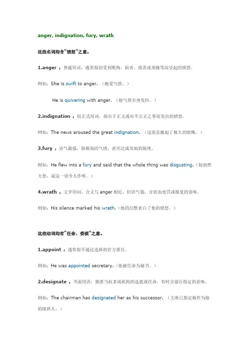 1.路way: Wherever there is room for an object to proceed, there is a way.road: A road is a prepared way for traveling with horses or vehicles.path: A way suitable to be traveled only by foot passengers or by animals.route: A route is a line of travel, and may be over many roads.street: A street is in some centre of habitation, as a city town or village, when it passes between houses of dwellings.avenue: A avenue is a long, broad and imposing(庄严) or principal street.2.时代(期) (时期)period: It indicates any passage of time, great or small. /an extent of time of any length. ( 时代)time(s): It refers to a period in history. in ancient times/ in Victoria time ( 新时代) epoch: It indicates a long period of time marked by events or development of a particular kind.The first flight into space marked a new epoch in the history of mankind. (纪元)era: It refers to a very long period of time marked by a particular feature in a great new era of world revolution ( 时期)age: It shows a particular /a fairly definite period in history. the Bronze Age, Iron Age3.战斗(打仗)fight: It is a bodily struggle ( 奋斗斗争)struggle: An effort of any kind to overcome difficulty. ( 战斗)battle: A fight between armed forces. ( 战役)campaign: A series of related military operations in a war. ( 战争)war: A period of fight between countries or states when weapons are used and many people are killed.( 对抗)combat: A fight, conflict, controversy.4.牧师(教士牧师) #priest: A person, esp. a man specially trained for various religious duties and ceremonies, in the Christian church, esp. in the Roman Catholic church ( 牧师)minister: A member of clergy, esp. Protestant churches. ( 牧师)clergy(pl): The officially appointed leader of the religious activities of a particular church or temple.clergyman: clergymen(pl) a member of clergy. ( 牧师)pastor: A Christian religious leader in charge of a church and its members, esp. in a Protestant church. ( 教区牧师)vicar: A priest in charge of an area(parish) in the church of England.father: A little of respect for a priest, esp. in the Roman Catholic.5.服装clothing(collect): (fml) General term of clothes.clothes(no single): Coverings of the body such as coats, dresses, suits, shoes, hats.garment(fl): A suit of clothes used by actors./a single article of clothing.costume: 1) The fashion of dress peculiar to a people, nation, class, period, etc.2) A dress worn by actors in a play. uniform: worn by all members of the community.dress: 1) A kind of outer garment worn by women ( 连衣裙).2) worn on special occasions (礼服) evening dress/ morning dresssuit: A set of outer clothes to be worn together. evening suit/swimming suitcoat: A garment with sleeves worn on top of other clothes from rain, heat, etc.overcoat: A warn coat worn in the street.6.哭cry: The most general one.(哭泣) weep: To let flow tears.(抽泣抽嗒) sob: To weep or sigh with short quick breaths.(哭天抹泪涕泪交流) snivel: To sniffle and cry in a irritating manner.(哭嚎又哭又闹) blubber: To cry loudly noisily.(发出低声报怨声) whine: To make a low complaining cry.(嚎哭) bawl: To utter loud cries (always in bad sense).(痛哭) wail: To cry aloud from pain or sorrow.(呻吟) moan: To make a low, miserable sound in pain or sorrow.(呻吟) grown: To make a low sound of pain, unhappiness or disapproval(哀悼) mourn: To feel or show sadness or sorrow for someone who has died.(哀悼) lament: To express great sorrow or regret.7.美丽漂亮good-looking: Having an attractive appearance in a strong, healthy way used for men and women not things.beautiful: ( a woman or a thing) Suggesting symmetry of features or perfection of proportion, elegance and mobility. beautiful flowers, a beautiful girl/voice/city/face beautiful weather.handsome: Of attractive appearance applies to men. a handsomefellow/actor/horse/buildings/young man.pretty: (a girl, or a small thing) Suggesting liveliness and sweetness, pleasing or nice to look at. a pretty little woman/garden, a pretty girl/ picture/piece of music,lovely: (something) So beautiful that it makes you feel good to look at it or even to think about it. The garden looks lovely.fair: Beautiful( of woman in poet) light in color esp., skin hair.gorgeous: (persons or things) (inf) Extremely beautiful or handsome.8.拉拖pull: The most general one.draw: It implies a smoother, steadier motion and generally a lighter force than pull.drag: It usually refers to horizontal motion or motion up an incline (slope) and it suggests laborious efforts over rough ground or against friction, resistance or gravity. The escaped prisoner was dragged out of his hiding place.haul: It implies continuous pulling or dragging of heavy or bulky objects. The fisherman is hauling a net.tug: It applies to hard often sudden violent effort to pull. He tugged at my sleeve to ask directions.jerk: To pull suddenly. He jerked out the knife that was stuck in the wound.tow: To pull by a rope or chain. We towed the car to the nearest garage.wrench: To pull hard with a twisting or turning movement.9.旋转turn: The most general one.( 自转) spin:To turn quickly around a central point. It emphasizes the continuity of the action, and usually the narrow extent of the circular motion. The wheel is spinning on its axis.( 急转) whirl:To round very fast. It implies the lock of conscious control.(转动) rotate: To turn round a fixed point with a circular movement. The earth rotates once every 24 hours.(绕转) revolve:To turn or move in a circle around a central point. It indicates circular or elliptical (椭圆) movement. The planets revolve around the sun.10.生气气愤anger: The most general one.(易怒) be cross:Feeling easy to get angry.(愤慨) indignation:(fml) Anger. It stresses righteous anger at what one considers unfair, mean or shameful.We expressed our indignation at the ruthless exploitation.(愤怒) wrath:Very treat anger. (literary) It suggests a