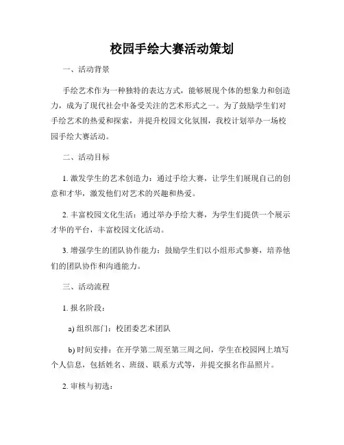 三、活动内容1. 手绘讲座本次活动将邀请校园知名手绘艺术家给学生们进行手绘讲座。