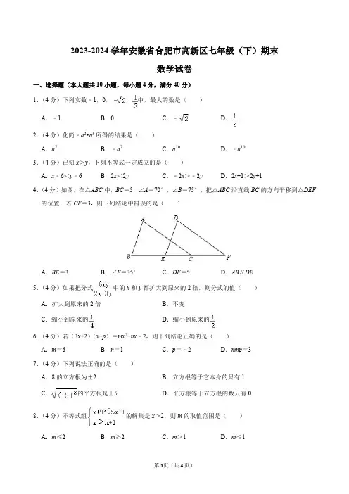 2023-2024学年安徽省合肥市高新区七年级(下)期末数学试卷一、选择题(本大题共10小题,每小题4分,满分40分)1.(4分)下列实数﹣1,0,,中,最大的数是()A.﹣1B.0C.﹣D.2.(4分)化简﹣a2•a5所得的结果是()A.a7B.﹣a7C.a10D.﹣a103.(4分)已知x>y,下列不等式一定成立的是()A.x﹣6<y﹣6B.2x<2y C.﹣2x>﹣2y D.2x+1>2y+14.(4分)如图,在△ABC中,BC=5,∠A=70°,∠B=75°,把△ABC沿直线BC的方向平移到△DEF 的位置,若CF=3,则下列结论中错误的是()A.BE=3B.∠F=35°C.DF=5D.AB∥DE5.(4分)如果把分式中的x和y都扩大到原来的2倍,则分式的值()A.扩大到原来的2倍B.不变C.缩小到原来的D.缩小到原来的6.(4分)若(3x+2)(x+p)=mx2+nx﹣2,则下列结论正确的是()A.m=6B.n=1C.p=﹣2D.mnp=37.(4分)下列说法正确的是()A.8的立方根为±2B.立方根等于它本身的只有1C.的平方根是±5D.平方根等于立方根的数只有08.(4分)不等式组的解集是x>2,则m的取值范围是()A.m≤2B.m≥2C.m>1D.m≤19.(4分)如图,已知AB∥CD,EF⊥AB于点E,∠AEH=∠FGH=20°,∠H=50°,则∠EFG的度数是()A.120°B.130°C.140°D.150°10.(4分)对于两个不相等的实数a、b,我们规定符号Max{a,b}表示a、b中的较大的值,如Max{2,4}=4,按照这个规定,方程Max{,}=﹣2的解为()A.0B.﹣2C.0或﹣2D.无解二、填空题(本大题共4小题,每小题5分,满分20分)11.(5分)分解因式:a3+2a2b+ab2=.12.(5分)不等式5x+2>3(x﹣1)的解集为.13.(5分)若,则分式=.14.(5分)(1)如图一,AB∥CD,∠B=135°,∠D=140°,则∠DEB=.(2)如图二,AB∥CD,∠F=60°,∠ABF=∠ABE.,∠CDF=∠CDE,DQ,BQ分别平分∠GDE 和∠HBE,则∠DQB=.三、(本大题共2小题,每小题8分,满分16分)15.(8分)计算:|﹣2|﹣+2﹣2﹣()0.16.(8分)先化简,再从0、﹣1、2、﹣2中选一个合适的数代入求值.17.(8分)如图,在网格图中,每个小正方形的边长为1.△ABC经过平移后得到△A'B'C',图中标出了点B的对应点B′.(1)画出平移后的△A'B'C';(2)连接AA'、CC',那么AA'与CC'的数量和位置关系是,线段AC扫过的图形面积为.18.(8分)观察以下等式:第1个等式:×(1+)=2﹣,第2个等式:×(1+)=2﹣,第3个等式:×(1+)=2﹣,第4个等式:×(1+)=2﹣.第5个等式:×(1+)=2﹣.…按照以上规律,解决下列问题:(1)写出第6个等式:;(2)写出你猜想的第n个等式:(用含n的等式表示),并证明.五、(本大题共2小题,每小题10分,满分20分)19.(10分)甲、乙两个工程队计划参与一项工程建设,已知甲队单独完成这项工程所需的天数是乙队单独完成所需天数的1.5倍;若由甲队先单独施工10天,乙队再加入,两队还需同时施工20天,才能完成这项工程.(1)求甲、乙两队单独完成这项工程各需多少天?(2)已知甲队每天的施工费用为3500元,乙队每天的施工费用为5500元,若该工程由甲、乙两工程队合作完成,则所需的施工费用是多少元?20.(10分)已知实数a的平方根为2x+1,1﹣7x,的整数部分为b.(1)求a,b的值;(2)若的小数部分为c,求25a﹣(b+c)2的立方根.21.(12分)今年“六一”前夕,某文具店花费2200元采购了A、B两种型号的文具进行销售,其进价和售价之间的关系如表:型号进价(元/个)售价(元/个)A型1012B型1520若两种型号的文具按表中售价全部售完,则该商店可以盈利600元.(1)问该商店当初购进A、B两种型号文具各多少个?(2)“六一”当天,A、B两种型号文具各剩下20%还未卖出,文具店老板在第二天降价出售,且两种型号文具每件降了同样的价格,要使得这批文具售完后的总盈利不低于546元,那么这两种型号的文具每件最多降多少元?22.(12分)阅读材料:形如a2±2ab+b2的式子叫做完全平方式.有些多项式虽然不是完全平方式,但可以通过配凑等手段,得到局部完全平方式,再进行有关运算和解题,这种解题方法叫做配方法.配方法在因式分解、代数最值等问题中都有着广泛的应用.示例:用配方法求代数式a2+6a+8的最小值,解:原式=a2+6a+9﹣1=(a+3)2﹣1∵(a+3)2≥0,∴(a+3)2﹣1≥﹣1,∴a2+6a+8的最小值为﹣1.(1)若代数式x2﹣8x+k是完全平方式,则常数k的值为;(2)用配方法求代数式4x2+4x+3的最小值;(3)若实数a,b满足a2﹣7a﹣b+13=0,求a+b的最小值.七、(本大题满分14分)23.(14分)如图,已知BD⊥AC,EF⊥AC,垂足分别为D,F.∠1=∠2,点Q是线段BD上一点(不与端点B重合),EM、EN分别平分∠BEQ和∠QEF交BD于点M、N.(1)请说明:DG∥CB;(2)当点Q在BD上移动时,请写出∠BQE和∠BNE之间满足的数量关系,并说明理由;(3)若∠1=α,则当点Q移动到使得∠BEN=∠BME时,请直接写出∠BEN=(用含α的代数式表示)2023-2024学年安徽省合肥市高新区七年级(下)期末数学试卷参考答案与试题解析一、选择题(本大题共10小题,每小题4分,满分40分)1.【分析】利用实数大小的比较方法:1、在数轴上表示的两个数,右边的总比左边的数大.2、正数都大于零,负数都小于零,正数大于负数.3、两个正数比较大小,绝对值大的数大;两个负数比较大小,绝对值大的数反而小.按照从小到大的顺序排列找出结论即可.【解答】解:∵<﹣1<0<,∴最大的数是:.故选:D.【点评】本题考查了实数的大小比较,掌握正数都大于零,负数都小于零,正数大于负数,两个正数比较大小,绝对值大的数大,两个负数比较大小,绝对值大的数反而小是本题的关键.2.【分析】根据同底数幂的乘法计算即可.【解答】解:﹣a2•a5=﹣a7,故选:B.【点评】此题考查同底数幂的乘法,关键是根据同底数幂的乘法的法则解答.3.【分析】根据不等式的基本性质对各选项进行逐一分析即可.【解答】解:A、∵x>y,∴x﹣6>y﹣6,原变形错误,不符合题意;B、∵x>y,∴2x>2y,原变形错误,不符合题意;C、∵x>y,∴﹣x<﹣y,∴﹣2x<﹣2y,原变形错误,不符合题