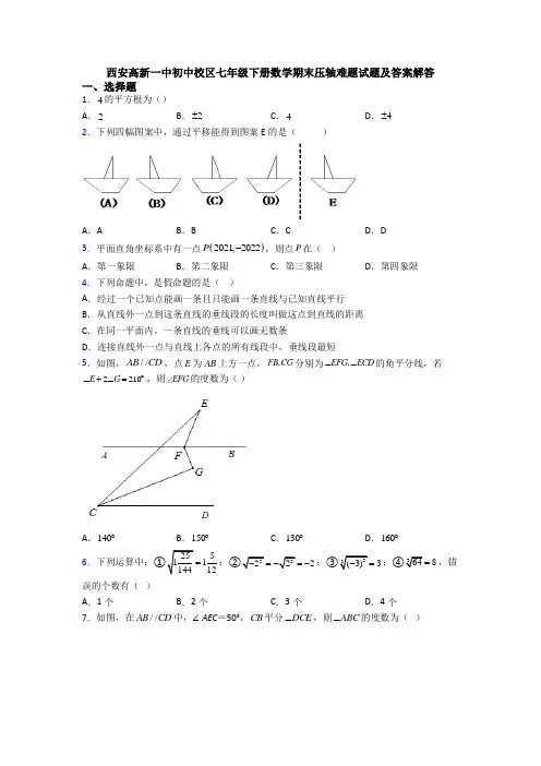 西安高新一中初中校区七年级下册数学期末压轴难题试题及答案解答一、选择题1.4的平方根为()A .2B .2±C .4D .4±2.下列四幅图案中,通过平移能得到图案E 的是( )A .AB .BC .CD .D3.平面直角坐标系中有一点()2021,2022P -,则点P 在( ) A .第一象限 B .第二象限 C .第三象限D .第四象限 4.下列命题中,是假命题的是( )A .经过一个已知点能画一条且只能画一条直线与已知直线平行B .从直线外一点到这条直线的垂线段的长度叫做这点到直线的距离C .在同一平面内,一条直线的垂线可以画无数条D .连接直线外一点与直线上各点的所有线段中,垂线段最短5.如图,//AB CD ,点E 为AB 上方一点,,FB CG 分别为,EFG ECD ∠∠的角平分线,若2210E G ∠+∠=︒,则EFG 的度数为( )A .140︒B .150︒C .130︒D .160︒6.下列运算中:2551114412;22222-=-=-;33(3)3-;3648=,错误的个数有( )A .1个B .2个C .3个D .4个7.如图,在//AB CD 中,∠AEC =50°,CB 平分DCE ∠,则ABC ∠的度数为( )A .25°B .30°C .35°D .40°8.如图,在平面直角坐标系上有点1,0A ,点A 第一次向左跳动至()11,1A -,第二次向右跳动至()22,1A ,第三次向左跳动至()32,2A -,第四次向右跳动至()43,2A …依照此规律跳动下去,点A 第124次跳动至124A 的坐标为( )A .()63,62B .()62,63C .()62,62-D .()124,123二、填空题9.若8x -+2y -=0,则xy =__________.10.平面直角坐标系中,点(3,1)--关于y 轴的对称点的坐标为________.11.如图,在△ABC 中,∠ACB =90°,AD 是△ABC 的角平分线,BC =10cm ,BD :DC =3:2,则点D 到AB 的距离为_____.12.如图,直线//AB CD ,若30ABE ∠=︒,150BEC ∠=︒,ECD ∠=______.13.如图, 把一张长方形纸片ABCD 沿EF 折叠后ED 与BC 的交点为G ,D 、C 分别在M 、N 的位置上,若∠EFG=54°,则∠EGB=_______.14.已知a ,b 为两个连续的整数,且19a b <<,则a b +的平方根为___________. 15.在平面直角坐标系中,若点()3,1P a a -+在第二象限,则a 的取值范围为_______. 16.在平面直角坐标系中,已知点A (﹣4,0),B (0,3),对△AOB 连续作图所示的旋转变换,依次得到三角形(1),(2),(3),(4)…,那么第(2013)个三角形的直角顶点坐标是______三、解答题17.(1)计算:3317362271? 48-++-- (2)比较325- 与-3的大小18.求下列各式中的x 的值:(1)2810x -=;(2)()3164x -=.19.请把以下证明过程补充完整,并在下面的括号内填上推理理由:已知:如图,∠1=∠2,∠A =∠D .求证:∠B =∠C .证明:∵∠1=∠2,(已知)又:∵∠1=∠3,( )∴∠2=____________(等量代换)AE FD ∴∥(同位角相等,两直线平行)∴∠A =∠BFD ( )∵∠A =∠D (已知)∴∠D =_____________(等量代换)∴____________∥CD ( )∴∠B=∠C()20.在如图的方格中,每个小方格都是边长为1个单位长度的正方形,三角形ABC的三个顶点都在格点(小方格的顶点)上,(1)请建立适当的平面直角坐标系,使点A,C的坐标分别为(﹣2,﹣1),(1,﹣1),并写出点B的坐标;(2)在(1)的条件下,将三角形ABC先向右平移4个单位长度,再向上平移2个单位长度后可得到三角形A'B'C',请在图中画出平移后的三角形A'B'C',并分别写出点A',B',C'的坐标.21.阅读下面的文字,解答问题:2是无理数,而无理数是无限不循环小数,因212<2212部分.请解答下列问题:29_______,小数部分是_________;(2)1015a,b,求10a b+二十二、解答题22.小丽想用一块面积为400cm2的正方形纸片,沿着边的方向裁处一块面积为300cm2的长方形纸片.(1)请帮小丽设计一种可行的裁剪方案;(2)若使长方形的长宽之比为3:2,小丽能用这块纸片裁处符合要求的纸片吗?若能,请帮小丽设计一种裁剪方案,若不能,请简要说明理由.二十三、解答题23.已知点C在射线OA上.(1)如图①,CD//OE,若∠AOB=90°,∠OCD=120°,求∠BOE的度数;(2)在①中,将射线OE沿射线OB平移得O′E'(如图②),若∠AOB=α,探究∠OCD 与∠BO′E′的关系(用含α的代数式表示)(3)在②中,过点O′作OB的垂线,与∠OCD的平分线交于点P(如图③),若∠CPO′=90°,探究∠AOB与∠BO′E′的关系.24.阅读下面材料:小颖遇到这样一个问题:已知:如图甲,//,AB CD E 为,AB CD 之间一点,连接,,35,37BE DE B D ∠=︒∠=︒,求BED ∠的度数.她是这样做的:过点E 作//,EF AB则有,BEF B ∠=∠因为//,AB CD所以//.EF CD ①所以,FED D ∠=∠所以,BEF FED B D ∠+∠=∠+∠即BED ∠=_ ; 1.小颖求得BED ∠的度数为__ ;2.上述思路中的①的理由是__ ;3.请你参考她的思考问题的方法,解决问题:已知:直线//,a b 点,A B 在直线a 上,点,C D 在直线b 上,连接,,AD BC BE 平分,ABC DE ∠平分,ADC ∠且,BE DE 所在的直线交于点E .(1)如图1,当点B 在点A 的左侧时,若,ABC ADC αβ∠=∠=,则BED ∠的度数为 ;(用含有,αβ的式子表示).(2)如图2,当点B 在点A 的右侧时,设,ABC ADC αβ∠=∠=,直接写出BED ∠的度数(用含有,αβ的式子表示).25.如图①,将一副直角三角板放在同一条直线AB 上,其中∠ONM =30°,∠OCD =45°.(1)将图①中的三角板OMN 沿BA 的方向平移至图②的位置,MN 与CD 相交于点E ,求∠CEN 的度数;(2)将图①中的三角板OMN 绕点O 按逆时针方向旋转,使∠BON =30°,如图③,MN 与CD 相交于点E ,求∠CEN 的度数;(3)将图①中的三角板OMN 绕点O 按每秒30°的速度按逆时针方向旋转一周,在旋转的过程中,在第____________秒时,直线MN 恰好与直线CD 垂直.(直接写出结果) 26.已知,//AB CD ,点E 为射线FG 上一点.(1)如图1,写出EAF ∠、AED ∠、EDG ∠之间的数量关系并证明;(2)如图2,当点E 在FG 延长线上时,求证:EAF AED EDG ∠=∠+∠;(3)如图3,AI 平分BAE ∠,DI 交AI 于点I ,交AE 于点K ,且EDI ∠:2:1CDI ∠=,20AED ∠=︒,30I ∠=︒,求EKD ∠的度数.【参考答案】一、选择题1.B解析:B【分析】根据平方根的定义,如果一个数的平方等于a,则.【详解】