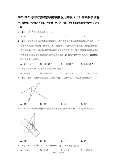 2022-2023学年江苏省苏州市高新区七年级(下)期末数学试卷一、选择题:本大题共8小题,每小题2分,共16分,在每小题给出的四个选项中,只有一项1.(2分)(x2)2的计算结果是()A.x2B.x4C.2x2D.x2.(2分)中芯国际集成电路制造有限公司,是世界领先的集成电路晶圆代工企业之一,也是中国内地技术最先进、配套最完善、规模最大、跨国经营的集成电路制造企业集团,中芯国际第一代14纳米FinFET技术取得了突破性进展,并于2019年第四季度进入量产,代表了中国大陆自主研发集成电路的最先进水平,14纳米=0.000000014米,0.000000014用科学记数法表示为()A.1.4×10﹣7B.14×10﹣7C.1.4×10﹣8D.1.4×10﹣93.(2分)已知a>b,则下列不等式不成立的是()A.3a>3b B.b+3<a+3C.﹣a>﹣b D.3﹣2a<3﹣2b 4.(2分)如图,△ABC≌△DBE,∠ABC=80°,∠D=65°,则∠C的度数为()A.20°B.25°C.30°D.35°5.(2分)将一个直角三角板和一把直尺如图放置,如果∠α=43°,则∠β的度数是()A.43°B.45°C.47°D.57°6.(2分)若A=﹣y2+4x﹣3,B=x2+2x+2y,则A、B的大小关系为()A.A>B B.A<B C.A=B D.无法确定7.(2分)若关于x的不等式组恰有三个整数解,则a的取值范围是()A.﹣2<a<﹣1B.﹣2≤a<﹣1C.﹣2<a≤﹣1D.﹣2≤a≤﹣1 8.(2分)如图,若△ABC和△DEF的面积分别为S1,S2,则S1:S2=()A.5:8B.8:5C.1:1D.无法确定二、填空题:本大题共8小题,每小题2分,共16分,把答案直接填写在答题卡相应位置上.9.(2分)命题“如果两个角是直角,那么它们相等”的逆命题是命题(填“真”或“假”).10.(2分)已知是二元一次方程4x+ay=5的一组解,则a的值为.11.(2分)一个多边形的内角和等于900°,则它的边数是.12.(2分)已知2x+y=1,则4x•2y的值为.13.(2分)已知x2+2mx+16是一个完全平方式,则m的值是.14.(2分)如图,在△ABC中,∠ACB=90°,∠B=42°,点D在边AB上,将△BCD 沿CD折叠,在点B′处.如果B′D∥AC,则∠BDC=°15.(2分)对非负实数x“四舍五入”到个位的值记为(x).即当n为非负整数时,若,则(x)=n.如(0.46)=0,(3.67)=4.给出下列关于(x)的结论:①(1.493)=1;②(2x)=2(x);③若,则实数x的取值范围是9≤x<11;④当x≥0,m为非负整数时,有(m+2023x)=m+(2023x);⑤(x+y)=(x)+(y).其中,正确的结论有(填写所有正确答案的序号).16.(2分)小亮在匀速行驶的汽车里,注意到公路里程碑上的数是一个两位数;1h后,看到里程碑上的两位数与第一次看到的两位数恰好互换了两个数字的位置;再过1h,看到里程碑上的数是第一次看到的两位数的两个数字之间添加一个0所得的三位数,则第三次看到的里程碑上的三位数是.三、解答题:本大题共11小题,共68分,把解答过程写在答题卡相应的位置上,解答时应写出17.(6分)计算:(1);(2)(x+1)2﹣(x+2)(x﹣2).18.(6分)因式分解:(1)a2b﹣9b;(2)x3﹣4x2y+4xy2.19.(4分)解方程组.20.(4分)解不等式组,并把它的解集在数轴上表示出来.21.(6分)完成下列的推理说明.如图,已知直线EF分别交直线AB、CD与点M、N,AB∥CD,MG平分∠EMB,NH平分∠END.求证:MG∥NH.证明:∵AB∥CD(已知).∴∠EMB=∠END().∵MG平分∠EMB,NH平分∠END(已知).∴,().∴∠EMG=∠ENH().∴MG∥NH().22.(6分)已知:如图,在△ABC中,D是BC的中点,点E、F分别在AB、AC上,且DE∥AC,DF∥AB,求证:BE=DF,DE=CF.23.(6分)已知x、y满足2x+3y=1.(1)若y>1,求x的取值范围;(2)若x、y满足x>﹣1,y≥,且2x﹣3y=k,求k的取值范围.24.(6分)某天小明在家锻炼身体.第一组运动是做15个波比跳,40个深蹲,完成后,运动监测软件显示共消耗热量107大卡(大卡是热量单位);第二组运动是做20个波比跳,20个深蹲,完成后,软件显示共消耗热量116大卡(每个动作之间的衔接时间忽略不计).(1)小明做每个波比跳和每个深蹲各消耗热量多少大卡?(2)若小明只做波比跳和深蹲两个动作,每个波比跳耗时4秒,每个深蹲也耗时4秒,小明想要通过8分钟的锻炼,消耗至少200大卡,至少要做多少个波比跳?25.(6分)如图,在△ABC中,∠B>∠C,AD⊥BC,垂足为D,AE平分∠BAC.(1)已知∠B=62°,∠C=38°,求∠DAE的度数;(2)已知∠B=3∠C,求证:∠DAE=∠C.26.(8分)阅读理解:由两个或两类对象在某些方面的相同或相似,得出它们在其他方面也可能相同或相似的推理方法叫类比法.多项式除以多项式可以类比于多位数的除法进行计算.如图1:∴278÷12=232,∴(x3+2x2﹣3)÷(x﹣1)=x2+3x+3.即多项式除以多项式用竖式计算,步骤如下:①把被除式和除式按同一字母的指数从大到小依次排列(若有缺项用零补齐).②用竖式进行运算.③当余式的次数低于除式的次数时,运算终止,得到商式和余式.若余式为零,说明被除式能被除式整除.例如:(x3+2x2﹣3)÷(x﹣1)=x2+3x+3余式为0,∴x3+2x﹣3能被x﹣1整除.根据阅读材料,请回答下列问题:(1)多项式x2+5x+6除以多项式x+2,所得的商式为;(2)已知x3+2x2﹣ax﹣10能被x﹣2整除,则a=;(3)如图2,有2张A卡片,21张B卡片,40张C卡片,能否将这63片拼成一个与原来总面积相等且一边长为(a+8b)的长方形?若能,求出另一边长;若不能,请说明理由.27.(10分)【问题提出】在一次课上,老师出了这样一道题:在四边形ABCD中,AB=AD,∠BAD=120°.∠B=∠ADC=90°,E、F分别是BC、CD上的点,且∠EAF=60°,试探究图1中线段BE、EF、FD之间的数量关系.小亮同学认为:延长FD到点G,使DG=BE,连接AG,先证明△ABE≌△ADG,再证明△AEF≌△AGF,则可得到BE、EF、FD之间的数量关系是.【探索延伸】在四边形ABCD中,如图2,AB=AD,∠B+∠D=180°,E、F分别是BC、CD上的点,∠EAF=∠BAD,上述结论是否仍然成立?说明理由.【结论运用】如图3,台风中心位于小岛(O处)北偏西30°的A处,台风中心风力12级,每远离台风中心40千米,风力就会减弱一级,某货轮位于小岛南偏东70°的B处,