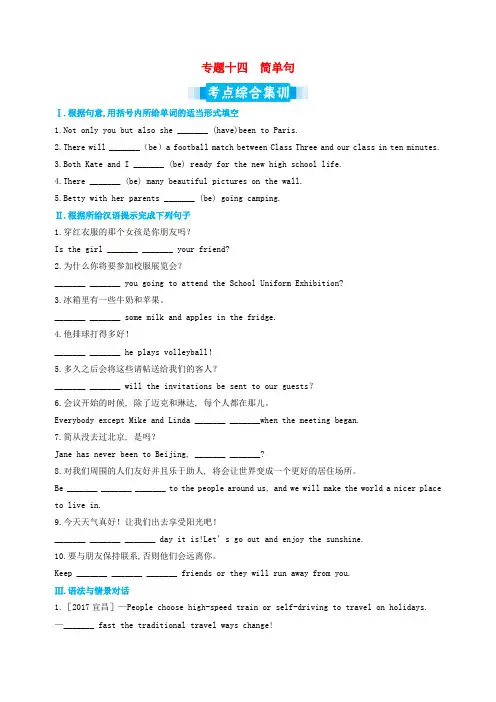 专题十四简单句Ⅰ.根据句意,用括号内所给单词的适当形式填空1.Not only you but also she _______ (have)been to Paris.2.There will _______(be)a football match between Class Three and our class in ten minutes.3.Both Kate and I _______ (be) ready for the new high school life.4.There _______ (be) many beautiful pictures on the wall.5.Betty with her parents _______ (be) going camping.Ⅱ.根据所给汉语提示完成下列句子1.穿红衣服的那个女孩是你朋友吗?Is the girl _______ _______ your friend?2.为什么你将要参加校服展览会?_______ _______ you going to attend the School Uniform Exhibition?3.冰箱里有一些牛奶和苹果。