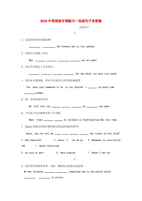 2019中考英语专项练习—完成句子含答案完成句子11. 这花园里的花真漂亮啊!_________ __________ the flowers are in this garden!2. 妈妈不让我晚上外出。
