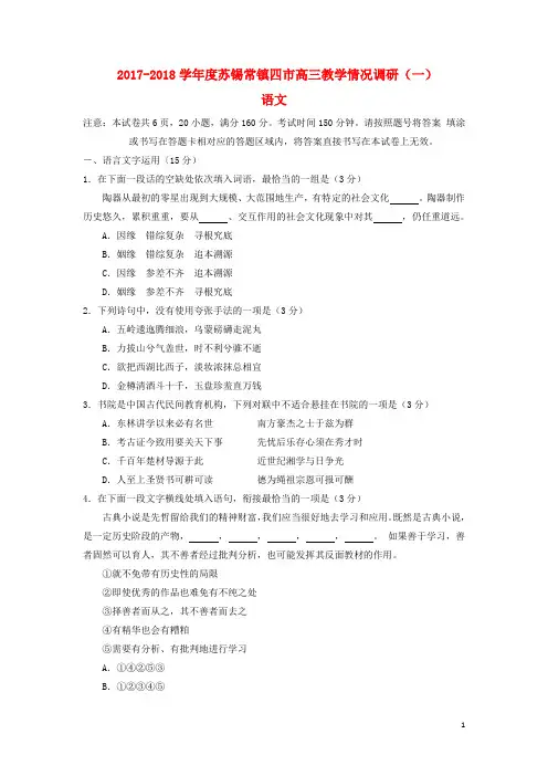 2017-2018学年度苏锡常镇四市高三教学情况调研(一)语文2018年3月一、语言文字运用(15分)1.在下面一段话的空缺处依次填入词语,最恰当的一组是(3分)陶器从最初的零星出现到大规模、大范围地生产,有特定的社会文化▲。