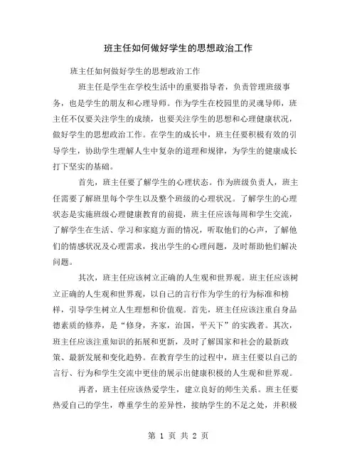 班主任如何做好学生思想工作6篇篇1班主任是班级的管理者和引导者,对于学生的成长和发展起着至关重要的作用。