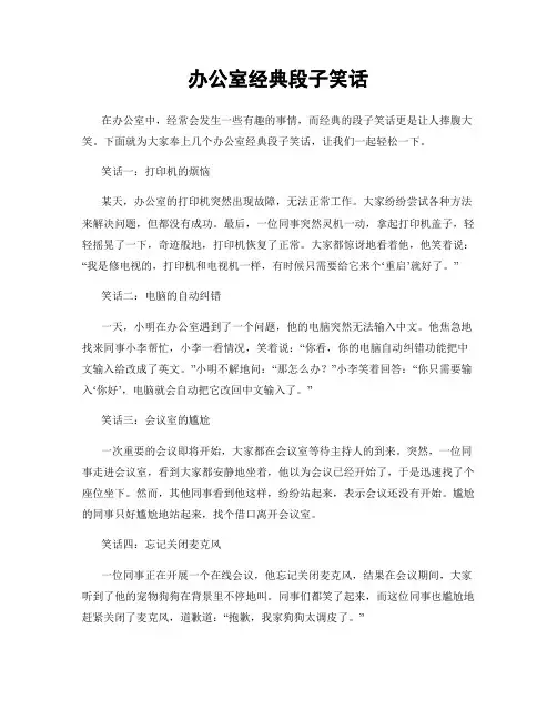 ”笑话四:办公室的打印机故障办公室里的打印机经常出故障,有一天,一位员工准备打印一份重要文件,结果发现打印机卡纸了。