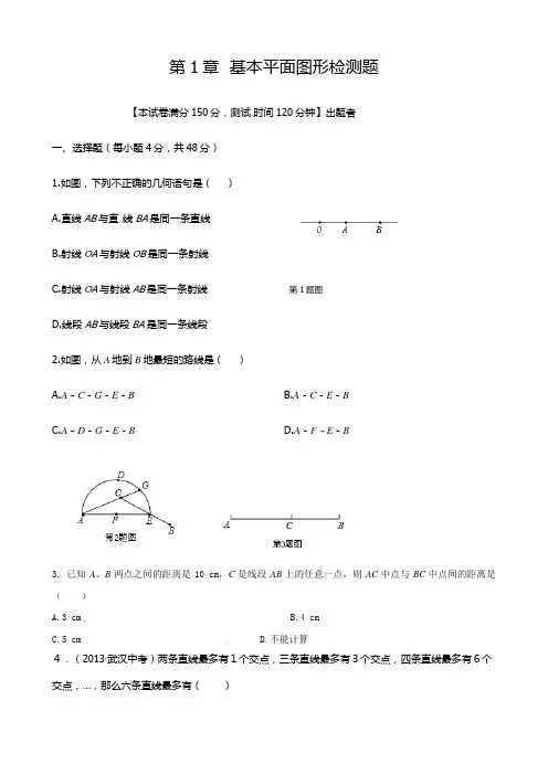 第1章基本平面图形检测题【本试卷满分150分,测试时间120分钟】出题者一、选择题(每小题4分,共48分)1.如图,下列不正确的几何语句是()A.直线AB与直线BA是同一条直线B.射线OA与射线OB是同一条射线C.射线OA与射线AB是同一条射线第1题图D.线段AB与线段BA是同一条线段2.如图,从A地到B地最短的路线是()A.A-C-G-E-BB.A-C-E-BC.A-D-G-E-BD.A-F-E-B3. 已知A、B两点之间的距离是10 cm,C是线段AB上的任意一点,则AC中点与BC中点间的距离是()A.3 cmB.4 cmC.5 cmD.不能计算4.(2013·武汉中考)两条直线最多有1个交点,三条直线最多有3个交点,四条直线最多有6个交点,…,那么六条直线最多有()A.21个交点 B.18个交点 C. 15个交点 D.10个交点5.已知α、β都是钝角,甲、乙、丙、丁四人计算(α+β)的结果依次是28°、48°、60°、88°,其中只有一人计算正确,他是( ) A.甲B.乙C.丙D.丁6.如图,B 是线段AD 的中点,C 是BD 上一点,则下列结论中错误的是( ) A.BC =AB -CDB.BC =AD -CDC.BC =(AD +CD )D.BC =AC -BD第6题图7.如图,观察图形,下列说法正确的个数是( )①直线BA 和直线AB 是同一条直线;②射线AC 和射线AD 是同一条射线; ③AB +BD >AD ;④三条直线两两相交时,一定有三个交点. A.1 B.2 C.3 D.48. (2013·福州中考改编)如图,OA⊥OB,若∠1=34°,则∠2的度数是( ) A.20° B.40° C.56° D.60°第8题图6121219.如图,阴影部分扇形的圆心角是()A.15°B.23°C.30°D.45°10、平面上有三点,经过每两点作一条直线,则能作出的直线的条数是()A、1条B、3条C、1条或3条D、以上都不对11、如图所示,已知∠AOB=64°,OA1平分∠AOB,OA2平分∠AOA1, OA3平分∠AOA2, OA4平分∠AOA3,则∠AOA4的大小为()A、 8°B、 4°C、 2°D、 1°12.如图,甲顺着大半圆从A地到B地,乙顺着两个小半圆从A地到B地,设甲、乙走过的路程分别为a、b,则()A.a=bB.a<bC.a>bD.不能确定第10题图二、填空题(每小题4分,共24分)13. 已知线段AB=10 cm,BC=5 cm,A、B、C三点在同一条直线上,则AC=_ _.14. 如图,OM平分∠AOB,ON平分∠COD.若∠MON=42°,∠BOC=5°,则∠AOD= __________.第12题图15. 如图,线段AB=BC=CD=DE=1 cm,那么图中所有线段的长度之和等于________cm.16. 一条直线上立有10根距离相等的标杆,一名学生匀速地从第1根标杆向第10根标杆行走,当他走到第6根标杆时用了6.5 s,则当他走到第10根标杆时所用时间是_________.17. (1)15°30′5″=_______″;(2) 7 200″=_______´=________°;(3)0.75°=_______′=________″;(4) 30.26°=_______°_______´______〞. 18. 平面内三条直线两两相交,最多有a个交点,最少有b个交点,则a+b=___________.三、解答题(共46分)19.(8分)按要求作图:如图,在同一平面内有四个点A、B、C、D.①画射线CD;②画直线AD;③连接AB;④直线BD与直线AC相交于点O.20.(10分)如图,C是线段AB的中点,D是线段BC的中点,已知图中所有线段的长度之和为39,求线段BC的长.第20题图21.(12分)已知线段,试探讨下列问题:(1)是否存在一点,使它到,两点的距离之和等于?(2)是否存在一点,使它到,两点的距离之和等于?若存在,它的位置唯一吗?(3)当点到,两点的距离之和等于时,点一定在直线外吗?举例说明.22.(12分)如图,在直线上任取1个点,2个点,3个点,4个点,填写下表:2)在直线上取n个点,可以得到几条线段,几条射线?23.(12分)如图,直线AB、CD相交于点O,OE平分∠AOD,∠FOC=97°,∠1=40°,求∠2和∠3的度数.24.(12分)已知:如图,∠AOB是直角,∠AOC=30°,ON是∠AOC的平分线OM是∠BOC的平分线.求∠MON的大小.25.(12分)如图,正方形ABCD内部有若干个点,用这些点以及正方形ABCD的顶点A、B、C、D 把原正方形分割成一些三角形(互相不重叠):(1)填写下表:(2)原正方形能否被分割成2 012个三角形?若能,求此时正方形ABCD内部有多少个点?若不能,请说明理由.。