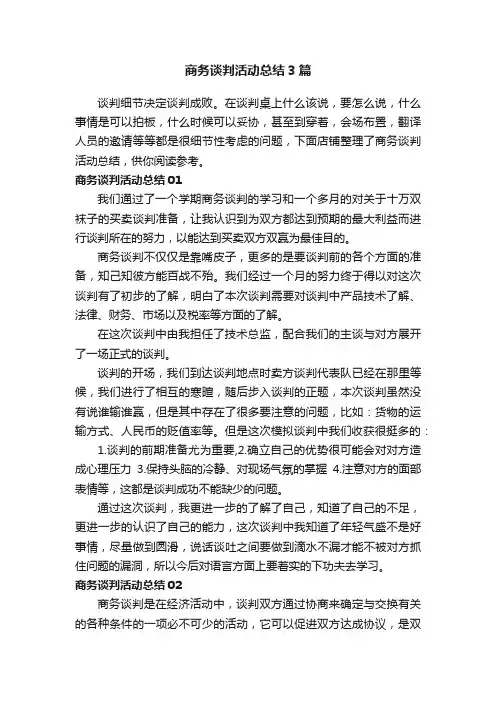 商务谈判活动总结02商务谈判是在经济活动中,谈判双方通过协商来确定与交换有关的各种条件的一项必不可少的活动,它可以促进双方达成协议,是双方洽谈的一项重要环节。