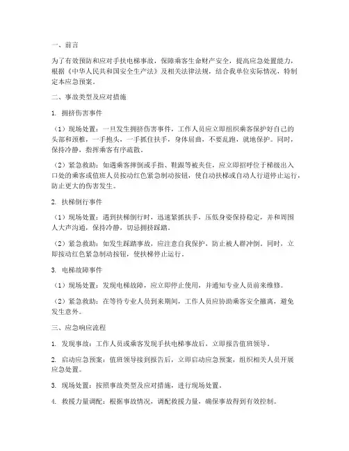 三、加强应急预案3.1 制定电梯事故应急预案制定完善的电梯事故应急预案,包括应急联系人、应急处理流程等,确保在发生事故时能够迅速有效地处置。