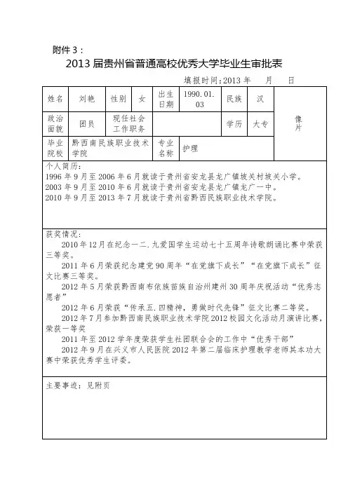 附件3:2013届贵州省普通高校优秀大学毕业生审批表刘艳,女,汉族,1990年01月出生于贵州省安龙县龙广镇坡关村海尾组。